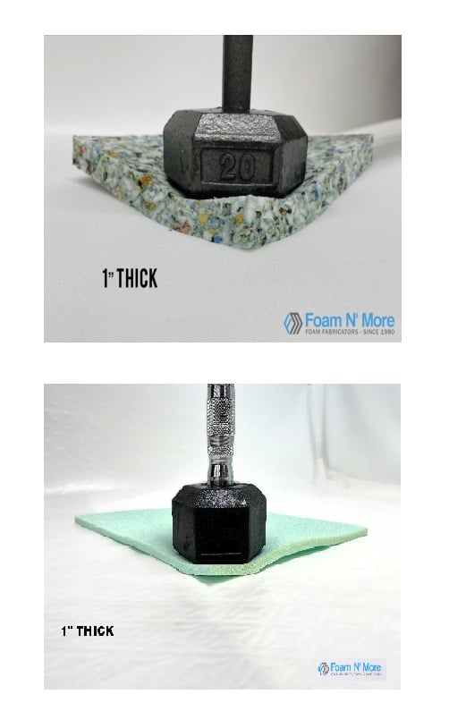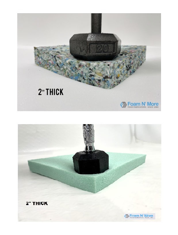 Rebounded Hard Foam: Also known as rebond, is an open-cell polyurethane foam that is firm and heavy but flexible and is made from reclaimed foam & scrap foam. Density is a 6lbs with a is 75 ILD.